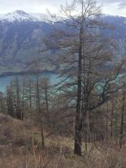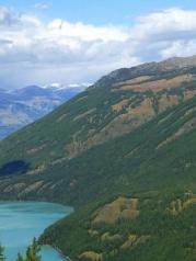 2017年5月9日新疆阿勒泰地區/布爾津/喀納斯景區/观鱼台 今天來到喀納斯景區第二天,在「白林快餐」吃了哈薩克早餐後,到了游客換乘中心乘區間車往觀魚臺,來回車費120元。 15分鐘車程到達,登上觀魚臺俯瞰喀納斯湖必須沿著棧道上1068級臺階,拾級而上臺階盛開了小野花,像是為我而打氣,沿途一階一景觀,從不同角度來觀賞喀納斯湖的風光。 木棧道修得非常好,看上去像很高,與湖面落差660米,上行與下行分隔而建,上山賞湖景,下山觀山峰,各有不同的視覺效果。 登上最高點,遠眺粼粼湖水舆白雪皚皚的友誼峰,把美景盡收眼底,胸中豁然開朗!一路走來有多累都值回票價!