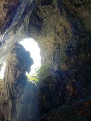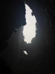 洞天仙境号称“华南第一天坑”,是天然景观,大自然的杰作,从狭小的洞口进来,豁然开朗。抬头望去,头顶像是被仙人开了个椭圆形的洞口,可以看到蓝天白云。明亮的阳光透射进来,仿佛可以看到一缕一缕的光线,四周是尖尖的山石以及浅浅的小山洞,底下有一湾碧潭,还有潭边的小桥。