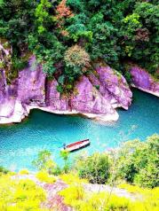 石桅岩停车场免费,景区是环形路,整个玩下来两个小时左右吧。开车的话就走环形路省事,哪进哪出,否则很麻烦。亮点是做一小段船,几分钟吧。清澈的湖蓝色的潭水配远处秀丽的山峰,再加上给你揺船的师傅,想想这画面就美。上船后不建议再爬上去看那个玻璃观景台了,个人感觉没意思,况且你还要原路回来。接下来就是按 路走呗,再走回大门口,反正景色就是你随便拍一张就可以做你手机的壁纸。