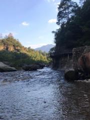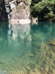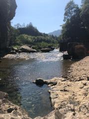 永嘉石桅岩,我们那天去的是下午,阴天,幸好没有雨,到了景区,就可以看到溪水清澈见底,水深的地方,很绿,旁边有一片竹林,环境很好,越是走到里面,溪水越是很急,可能是刚下过雨吧!
