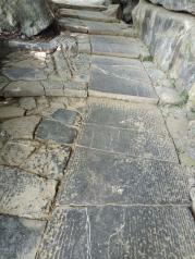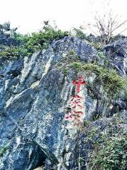 沿千家峒路往北,很快就驶出了城区,雨中的田野山峦, 都蒙上了一层水幕。经过一处山岩,外表嶙峋,颜色黝黑,呈现被外力撕裂后的恐怖状。隐隐觉得此地应是一处遗迹。停车细看,果然崖壁上隐约有“穿岩”二字,哦,这里就是当年千家峒的唯一入口,瑶族祖先的故事,就从这里开始。
