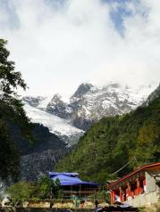 明永冰川山顶冰雪终年不化。上山有两种方法,自己走或骑骡子,当时我们的价格是150来回,我们一车人都选择了骑骡子,因为导游说我们自己走要四个小时,而且怕有高原反应,我们发现全负武装把自己包裹起来,骑着骡子上山挺有意思的。碰到去看冰川的桥塌了,我们只能看到整个冰川冰已融化的差不多了,冰很少