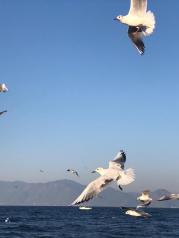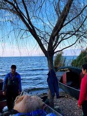 早晨起床就到抚仙湖健身步道徒步,观赏抚仙湖美丽的风景,在湖边遇上了一家三口打鱼归来正在收网,准备回家,发现他们捕的鱼中有一种亮晶晶闪着银光的很小的鱼,经和他们交谈才知道这是抚仙湖的珍贵鱼种银鱼。