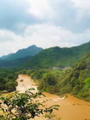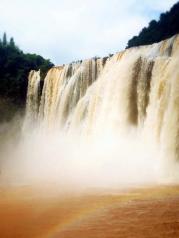 七月正值罗平汛期,号称中国最美六大瀑布之一的罗平九龙瀑布群也是非常很壮观,九龙河的河里翻着泥沙,水呈北方土黄色,类似黄河水,略有差别就是黄中泛红。因前夜下雨,云厚,缺蓝,略晴朗。汛期水急,特色的竹排游览取消了,观瀑索道也因游客稀少停运了