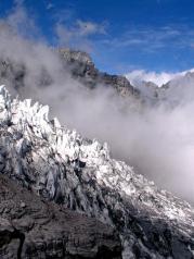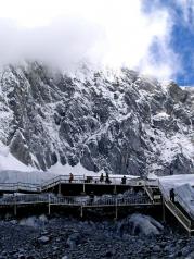 玉龙雪山: 坐索道上山途中,周围是长年不化的积雪,巨大的岩石和茂密的冷杉树林。到了4506米的索道终点站,我的眼前是一片白皑皑的积雪,就象来到了冰雪王国。玉龙雪山有十三个峰,犹如一条腾飞的巨龙,直插蓝天,万里无云,雪峰以蓝天为背景就象一幅美不胜收的画卷。这里的海拔地势高,人容易缺氧,引起高原反应,所以只能慢走,不能跑、跳,不能兴奋地大喊大叫,如有不舒服的时候就吸口氧。