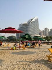 广东湛江东海岛海滩,面向南太平洋,呈南北走向,沙滩连续不断的长度为20663米,宽度随潮位涨落约100至300米左右,海湾呈新月形,沙细且白,不仅是旅游度假的好去处,也是湛江市著名的旅游景点和标志,让人流连忘返。