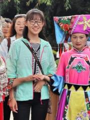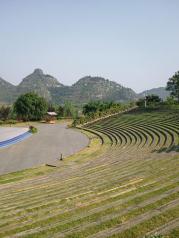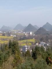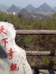 双乳峰景区4A级景区,景区内部有两个核心的景点:第一个是小石林,第二个是布依广场。 讲解员带我们通过健身步道,走进小石林景区,仿佛进入另外一个世界,各式各样的小石林,令人产生无限的遐想,夫妻离别,恋人相拥,桃园三结义,老猪背小猪,各种形态各种现象。小石林景区在外面是看不到的,它被围在一个山间的盆地中,只有进了景区还能欣赏到。 经过了生态农庄,路过贞观庙,我们坐着电瓶车,来到核心景区布依广场,这里二月二三月三六月六等布依族的节日里会有演出,据说盛况空前。站在这里远眺远处山峦,角度最佳,可以看到闻名的双乳峰,山前还有座小山丘,像胸前的宝石项链。我们在讲解员告诉我们的最好照相位置留了影。看着奇妙的山