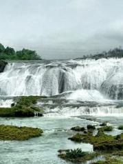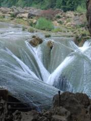 银链坠潭瀑布位于天星桥景区内,从景区入口到达高老庄后,景色越来越有特色,游人也越来越少,一路都有流水潺潺相伴。经过桥上桥上桥后,植被越来越茂盛,几百年的黄葛榕比比皆是。湍急的河水在积聚力量,终于在这里迸发。 这个瀑布只有十余米高,上面成漏斗形状,底部是槽状溶洞潭,在潭沿面上隆起的石包,象一张张下覆的莲叶,交错搭连,河水在每一张叶面上均匀铺开,纵情漫流,象千千万万条大大小小的银链,轻音嚷嚷地缓缓坠入溶潭,永远没完没了。三岔河水被钙化滩分成串串珠链,坠入深潭,是黄果树瀑布群中最秀美的瀑布。 它既不是以高取胜,也不是以阔或大惊人,而是以它千丝万缕的情态,如泣如诉的瀑声,让人看见就不想离开。